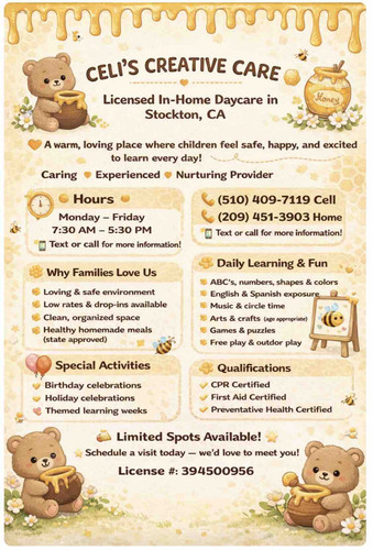 Located in the city of Stockton, our daycare is in a quiet and safe family-oriented neighborhood with a park. We are close to street parking.