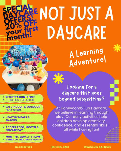 Welcome to Honeycomb Fun Daycare! We are three licensed providers that offer childcare for families looking to provide their child with a loving and safe environment that’s just like home. At our home daycare, our goal is to help children learn important social, emotional, and behavioral skills that prepare them for a successful and happy future. We offer programs for a wide variety of ages from 6 months to 10 years. At our daycare, we provide a culturally diverse learning environment by offering programs in Spanish. We look forward to hearing from you! Please contact us to schedule a tour for you and your family.